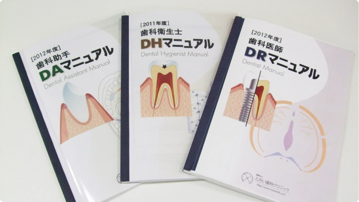 とみい歯科クリニックでは、独自のオリジナルマニュアルを用意しています。自費診療のインプラント、口腔外科、審美治療、ホワイトニングなど幅広い治療メニューに対応し、新人スタッフが安心して業務を行えるよう、丁寧な手順を詳細に解説しています